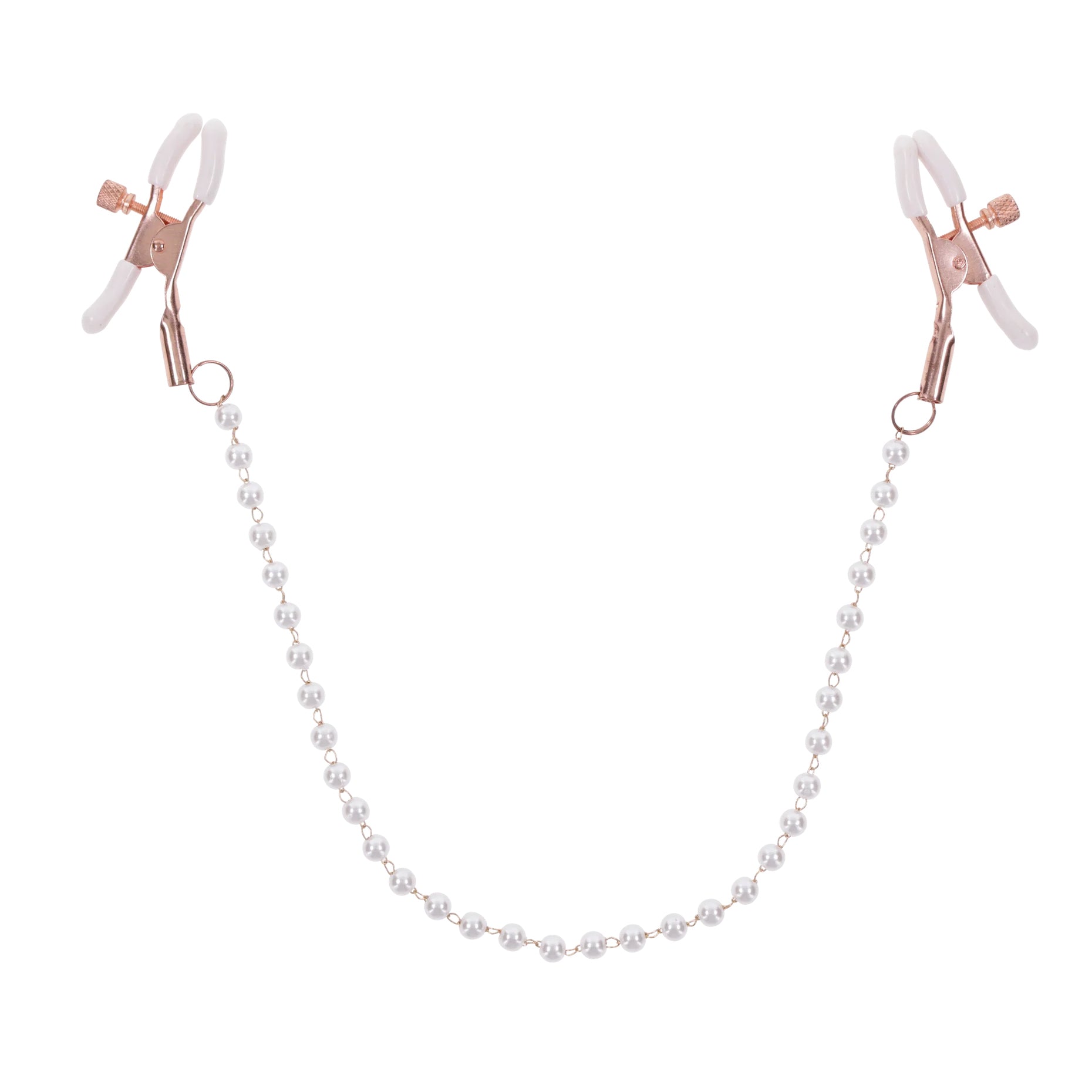 De witte rubberen uiteinden zorgen ervoor dat de klemmen comfortabel aanvoelen en goed blijven zitten, zonder weg te glijden. Trek speels aan de roségouden ketting om de druk te verhogen en zie hoe de prikkeling zich door het lichaam van je geliefde verspreidt. De elegante parels geven jullie kinky spel een chique, bijna juweelachtige uitstraling – ideaal in combinatie met lingerie, bondage of een verleidelijke outfit.